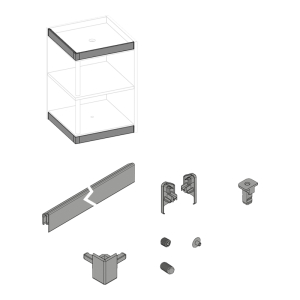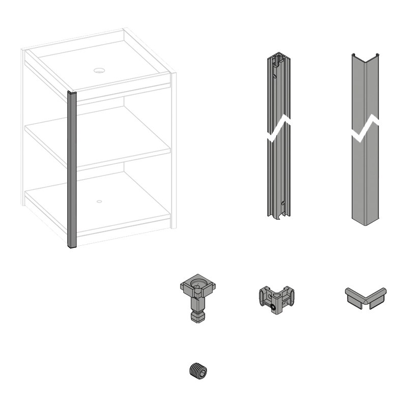 Kit d’accessoires pour le raccord vertical des panneaux supérieur et inférieur d’un meuble Spin Un kit est nécessaire par meuble SpinEn option : kit de tablettes pour tablettes (à commander séparement)Profilé et cache : longueur 3000 mm, à recouperKit composé de :