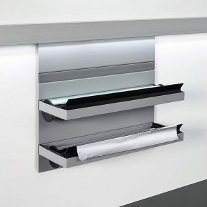 Le profil porte accessoires en aluminium décor inox peut être vissé ou collé à la paroi, et de ce fait fixé sur une crédence en verre. Il peut être utilisé comme bandeau lumineux, il diffuse alors un éclairage indirect sur les différents éléments.