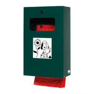 Distributeur de sacs pour déjections canins en acier galvanisé avec revêtement par poudre polyester époxy Anti-UV.Equipé d'une serrure triangulaire (1 clé).Livraison avec pictogramme et accessoires de montage pour fixation au mur ou sur poteau.
