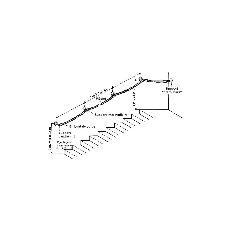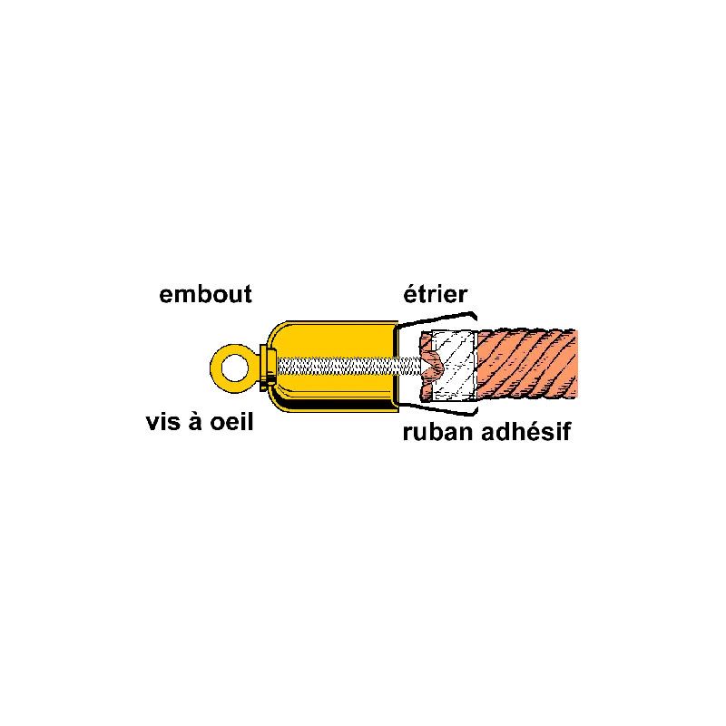 Monter à une des extrémités de la corde un embout. Centrer la corde dans l'étrier avec la vis à oeil. Visser l'ensemble jusqu'à complet serrage.