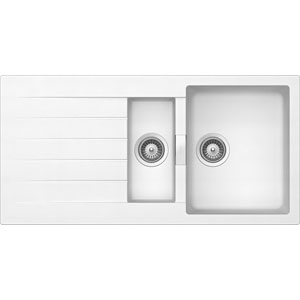 2 bacs + 1 égouttoir.Vidage manuel. Montage réversible. Egouttoir droite ou gauche.Non percé mais avec pré-perçage.Livré avec fixations, siphon et bonde inox Ø90mm.
