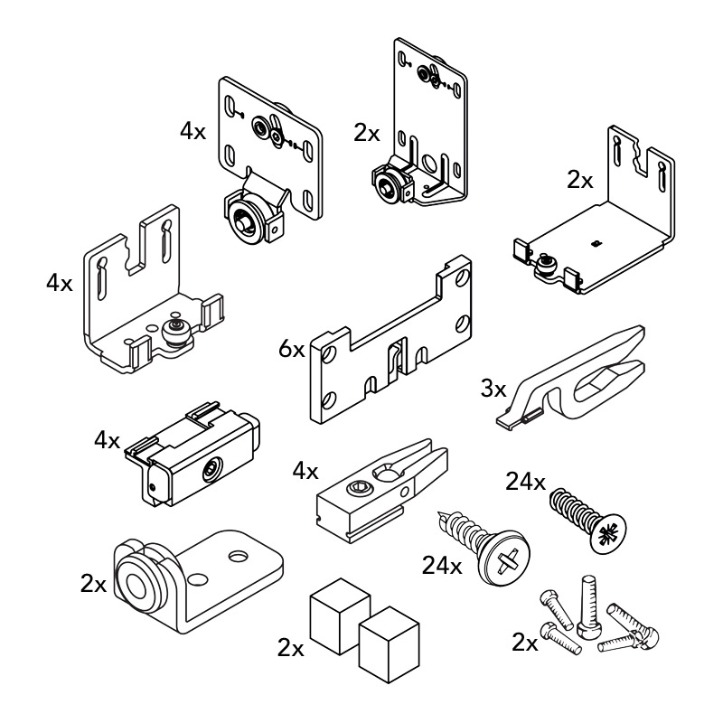 Ferrure pour portes coulissantes à 2 ou 3 vantaux en bois à roulement par le bas.