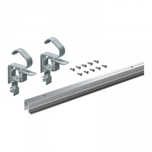 La ferrure de base est composée d'une pièce de coulissage et une pièce de guidage pour une porte pliante avec 2 vantaux et d'accessoires de fixation, sans charnière centrale.