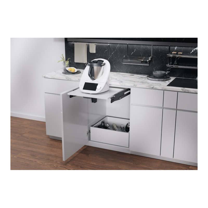 ChefsTable fait passer l'organisation de la cuisine à un niveau supérieur. Équipée d'un ingénieux mécanisme relevant parallèle, cette tablette pivotante permet de faire sortir en douceur et en toute sécurité les appareils lourds vers l'extérieur. Que ce soit pour le Thermomix ou pour les robots de cuisine, la ferrure pivotante est conçue pour tous les ustensiles de cuisine jusqu'à 16 kg de charge.