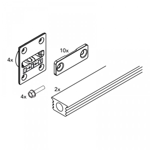 Fonction Push-to-open pour des structures sans poignée. Kit complet composé de :Rails de roulement et de guidage aluminium),de 2 unités escamotables avec éjection de porte, profils de raccordement de corps (ferrure d’assemblage 110 mm), profil de montant horizontal, charnières à corps, charnière à corps central avec ressort, protection d’escamotage, amortisseur de porte pliante, Push-to-open pour porte pliante.