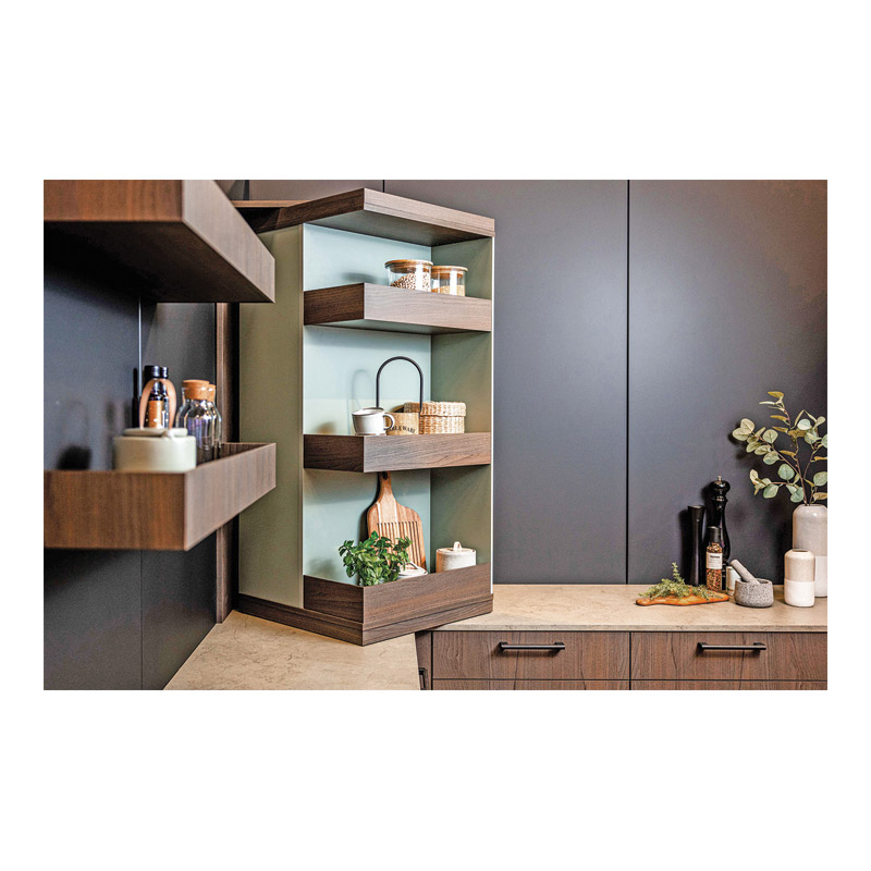 Une étagère de salon transformable haut de gamme. Bien plus qu’une simple étagère de salon :un meuble magique pour une expérience hors du commun.Une rotation élégante suffit pour que le meuble dévoile tout ce qu’il a enlui. Avec une touche supplémentaire, l'intérieur du meuble disparaît de la vue et les meubles présentent à nouveau des façades fermées. « The Joy of FurnSpin » de Hettich fascine dans les différents univers du meuble.