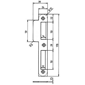 Gâche équerre en argent N.1 FKV avec 2 trous de fixation Description : Largeur 20 mm Hauteur 170mm Cette gâche équerre existe : en bouts ronds (référence Socomenal 1500790) en bouts carrés (référence Socomenal 1500550)