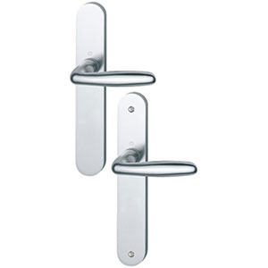 Ensemble monobloc : béquilles et rosaces solidarisées.Rosaces avec ressort de rappel intégré. Sous rosaces en polyamide chargé de fibre de verre à piliers pour fixation traversante EA 38 mm.Fourni avec vis de fixation M4.Pour porte épaisseur standard de 40 mm.