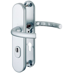 Garnitures de sécurité Modèle: M86G/3332A-ZA/3440/1710RH Garniture de sécurité bouton/poignée HOPPE en laiton sur plaques longues avec protecteur de cylindre, pour porte d'entrée : Assemblage : bouton déporté fixe réversible côté extérieur; poignée [...]