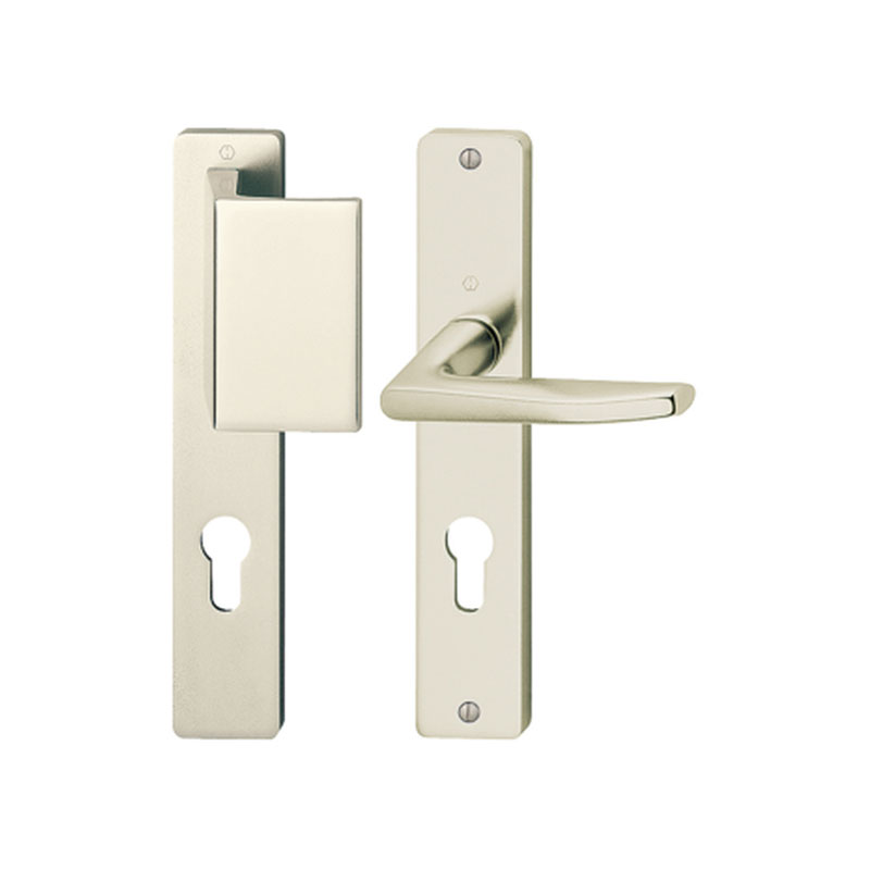 Garnitures sans classe de résistance pour portes d'entrée et palières Modèle: 504/202M/111F Garniture aileron de tirage/poignée HOPPE en aluminium sur plaques longues, pour porte d'entrée FINITION F2 CHAMPAGNE CLE I