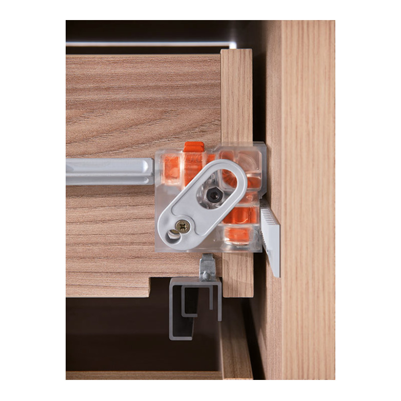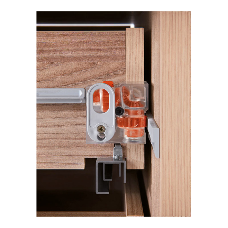 Élément de jonction entre tiroir, coulisses et meuble. Stabila permet d’améliorer la stabilité et d’harmoniser tous les composants impliqués dans l’ouverture du tiroir en offrant un mouvement fluide et homogène.Avec sa fixation sur le dos des tiroirs, le montage est simple et rapide.La synchronisation des coulisses et l’association de tous les éléments solutionnent parfaitement l’ouverture et la fermeture des tiroirs sans poignée.Il s’adapte aux tiroirs bois avec coulisses à sortie totale ou partielle.Composé de plusieurs éléments :