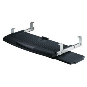 Support clavier informatique avec tablette à souris escamotable et orientable.Equipé d'un plumier.Sur coulisse à billes sortie partielle.Hauteur entre plateau et dessous de bureau réglable de 80 à 110 mm.