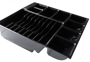 Tiroir caisse en bois robuste avec serrure à combinaisons et alarme sonore.Equipé de côtés de tiroirs métalliques, façade médium gris foncé vernis.Trieur à monnaie et à billets extractible.Pour bar, banques...