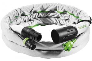 Flexible d'extraction reliant la ponceuse à l'extracteur de poussière. Ce flexible est conique. Un flexible d'extracteur de poussière de forme conique améliore l'aspiration de la poussière.